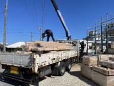 2024.10.16足場設置完了し、プレカット材の搬入となりました🚚 クレーンで慎重に降ろしてます! 土台の施工へ進めていきます。足場設置完了し、プレカット材の搬入となり