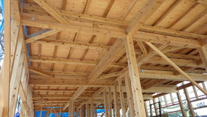 土台が完了したら、柱を建てて、棟上げまで一気に仕上げて
