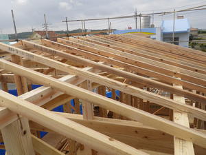 屋根の野地板まで施工が完了し、早速ルーフィングを張って