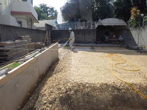 散布後、ポリシートを被せ、鉄筋工事へと工程を進めて